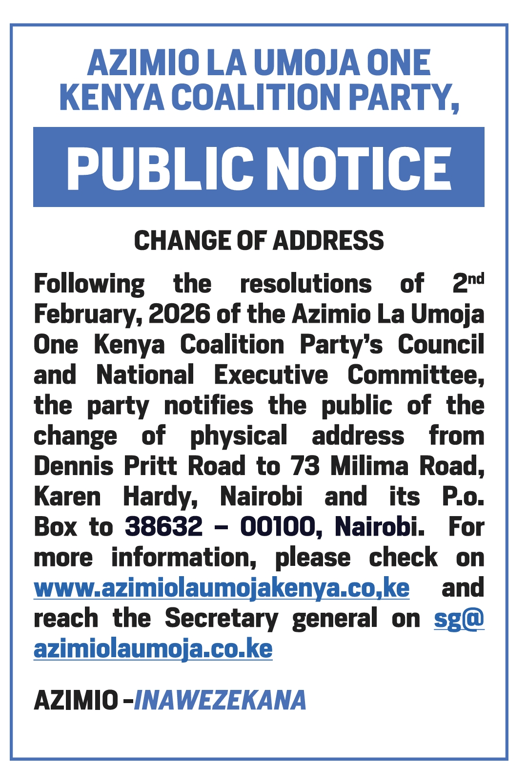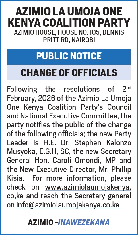 The Azimio la Umoja One Kenya Coalition Party has undergone strategic leadership changes following the joint resolutions of the Council and National Executive Committee on February 2, 2026. These updates reflect our commitment to renewal, unity, and effective leadership as we advance our national agenda of Utu , Undugu ,Usawa , Umoja, and Uzalishaji